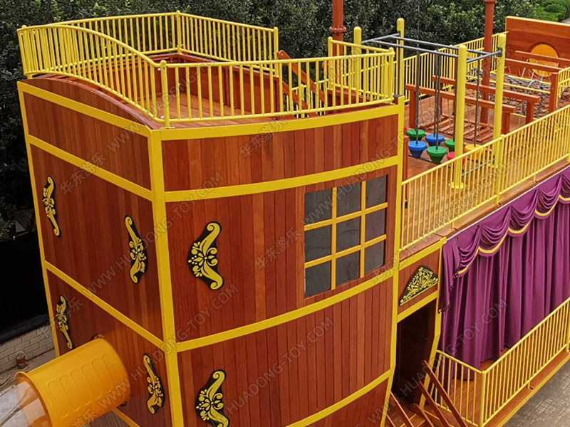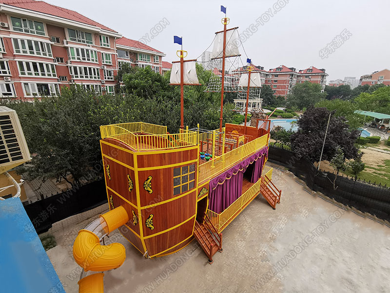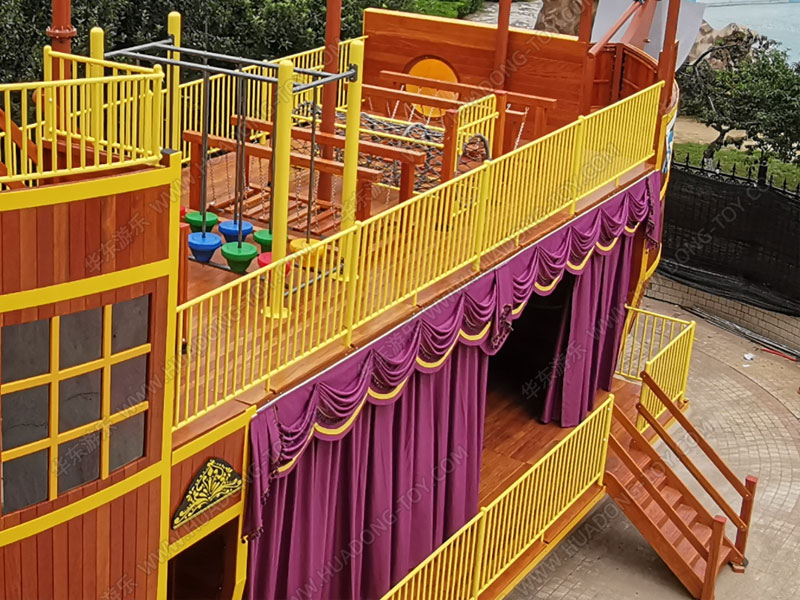 北京幼兒園案例是一個以海盜船為模型設計的游樂設施,該項目整體采用木質(zhì)結(jié)構(gòu)進行設計,改變了以往海盜船的設計風格,為結(jié)合整個場地的合理化利用,新增了演出舞臺、平衡蕩橋、組合滑梯、鉆洞爬網(wǎng)、踩樁 等游樂設備。