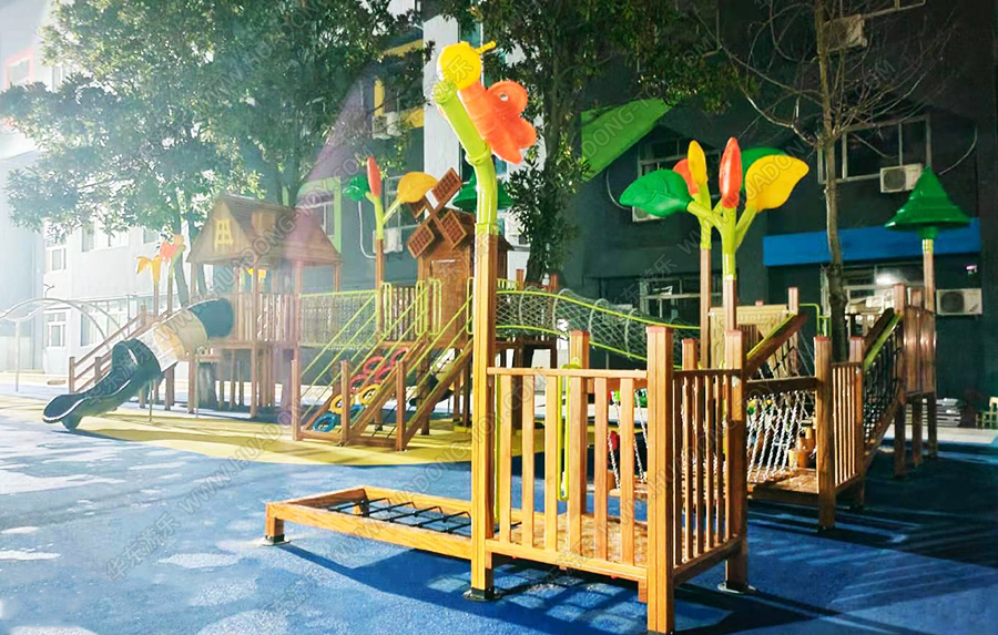 江蘇省泰興市育紅幼兒園城西分校是經(jīng)教育部批準(zhǔn)的優(yōu)秀幼兒園,該幼兒園此次采用的是華東游樂生產(chǎn)的木制系列產(chǎn)品,具有爬網(wǎng)、攀爬、滑梯、腳踏水車、傳聲筒、鉆洞等游樂設(shè)施。