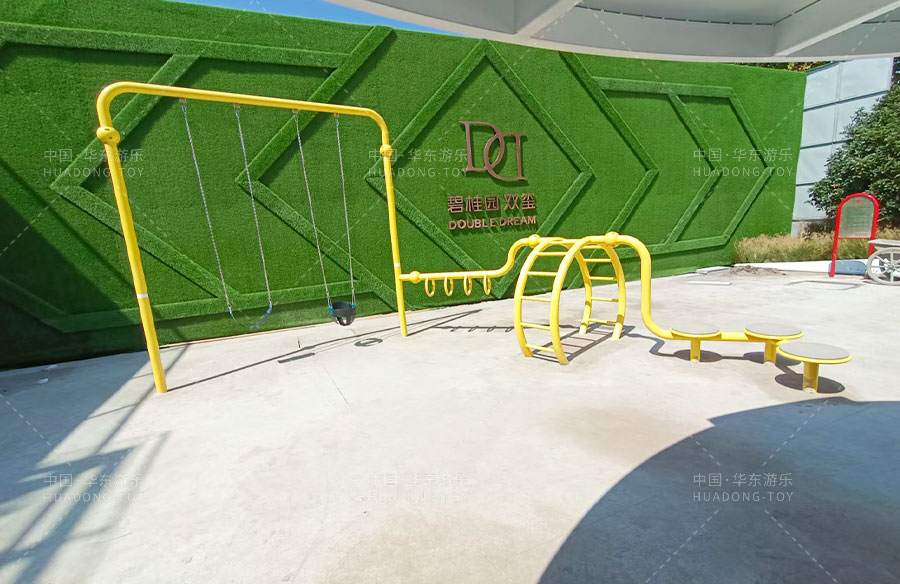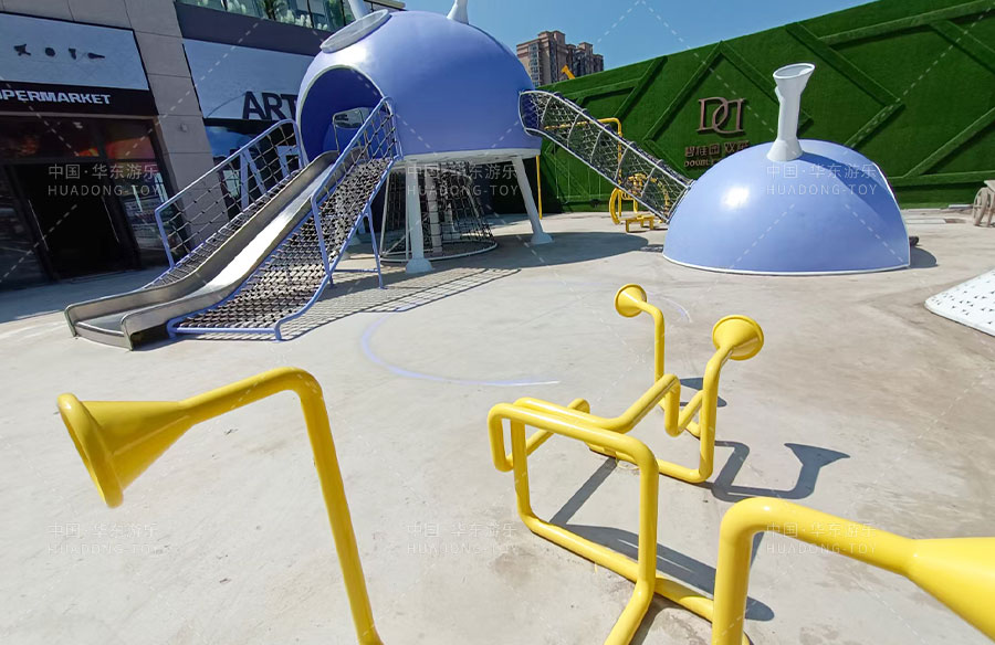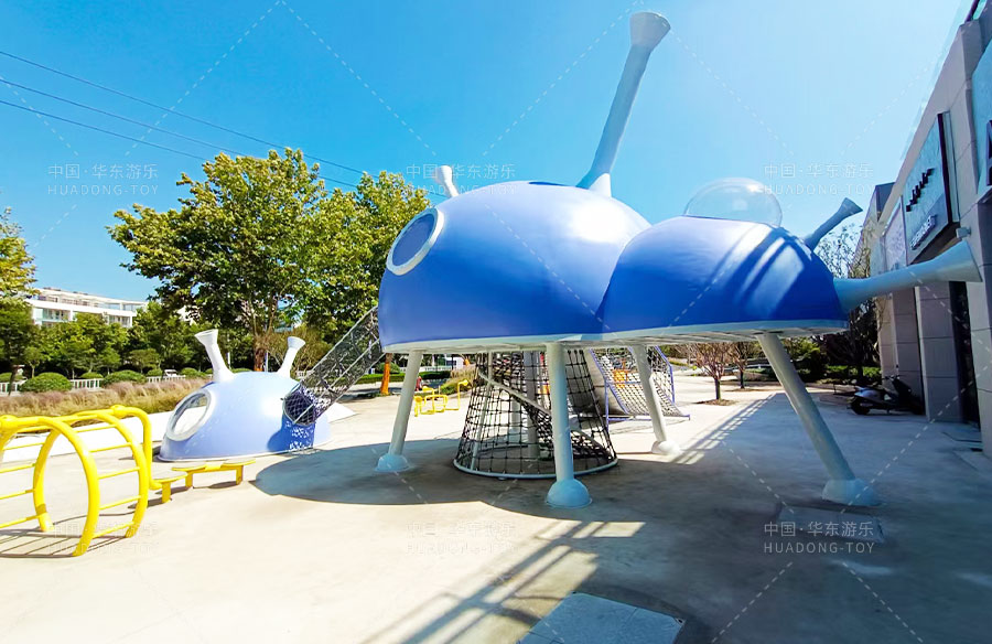 此次項(xiàng)目采用的是華東游樂自主設(shè)計(jì)的飛碟主題的游樂設(shè)備,新增了傳聲筒、爬網(wǎng)、兒童秋千、鉆洞、不銹鋼滑梯等功能。