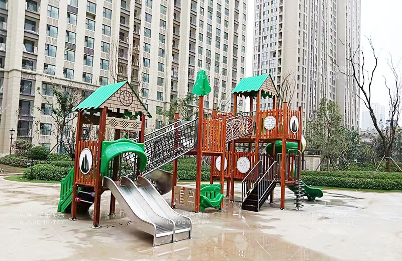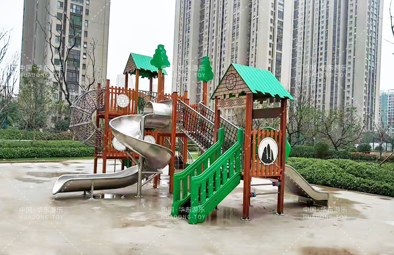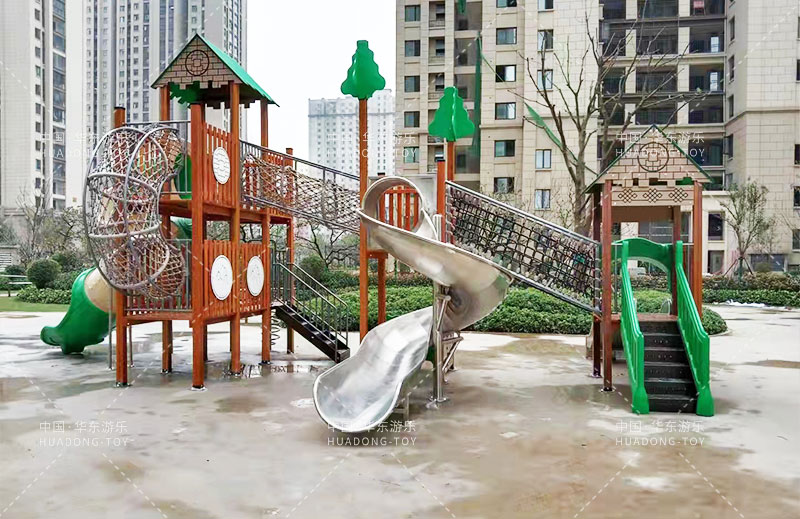 榮盛華府選用的是華東游樂(lè)自主設(shè)計(jì)的具有攀爬網(wǎng)、U型爬網(wǎng)、不銹鋼滑梯、網(wǎng)橋、滑桶為一體的綜合性游樂(lè)設(shè)備。