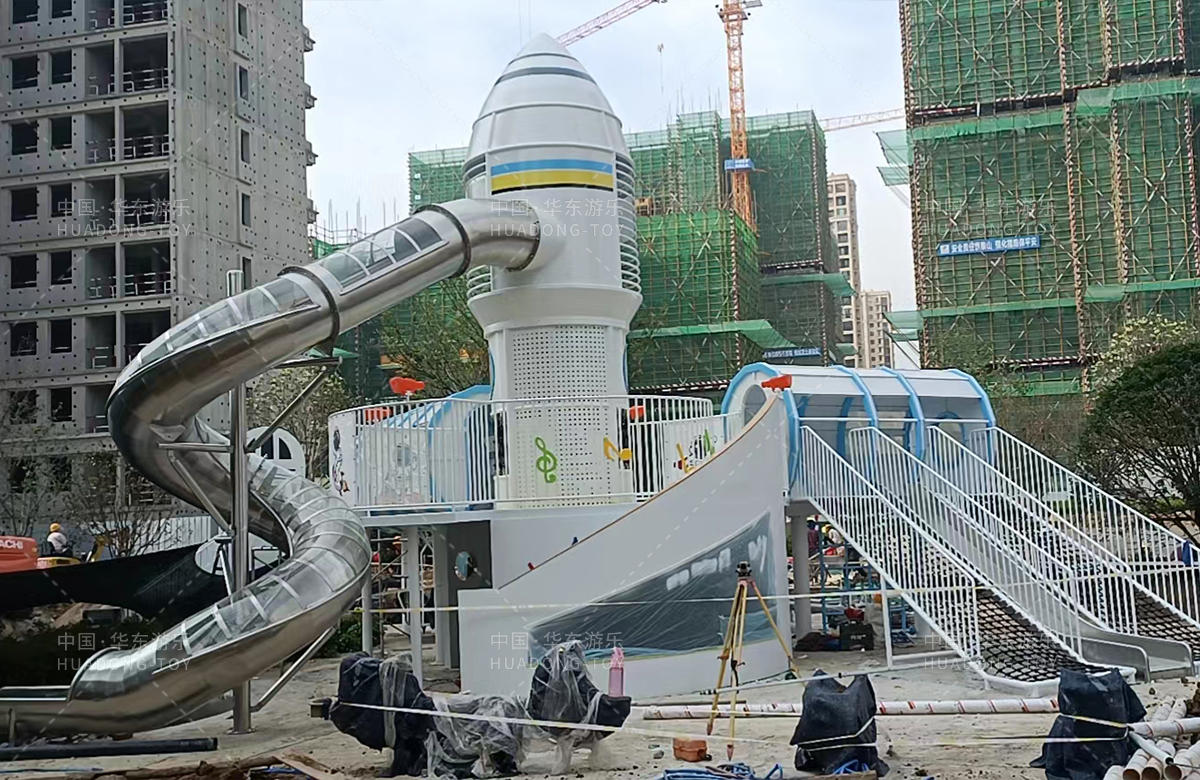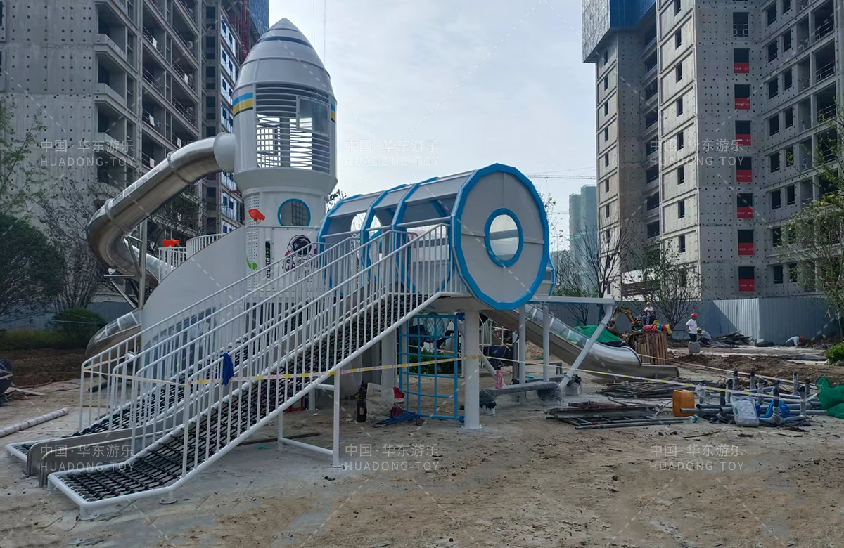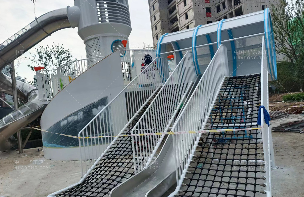 安徽省亳州市渦陽縣榮徽上河郡選用的是華東游樂自主研發(fā)和生產(chǎn)的以航天飛機為主題的大型非標(biāo)定制的游樂設(shè)備,是一款具備了攀爬網(wǎng)、攀爬梯、旋轉(zhuǎn)滑筒、兒童搖搖樂為一體的綜合性兒童游樂場。