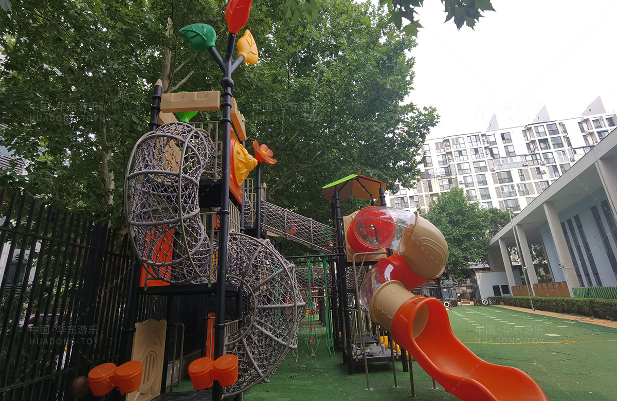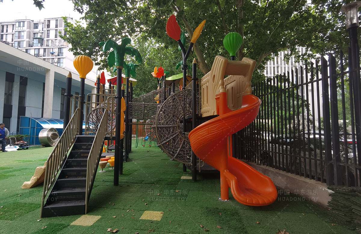 北京市朝陽(yáng)區(qū)管莊忠德幼兒園選用的是華東游樂(lè)自主研發(fā)和設(shè)計(jì)的大自然系列組合滑梯,該滑梯是一款具備了攀爬網(wǎng)、鉆洞、滑梯、叢林拓展、拍拍鼓、攀爬墻、固定踏踏車、平衡樁等功能為一體的綜合性 游樂(lè)設(shè)備,能夠很好的鍛煉小朋友的全面發(fā)展。