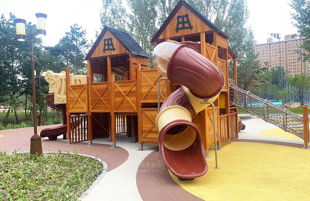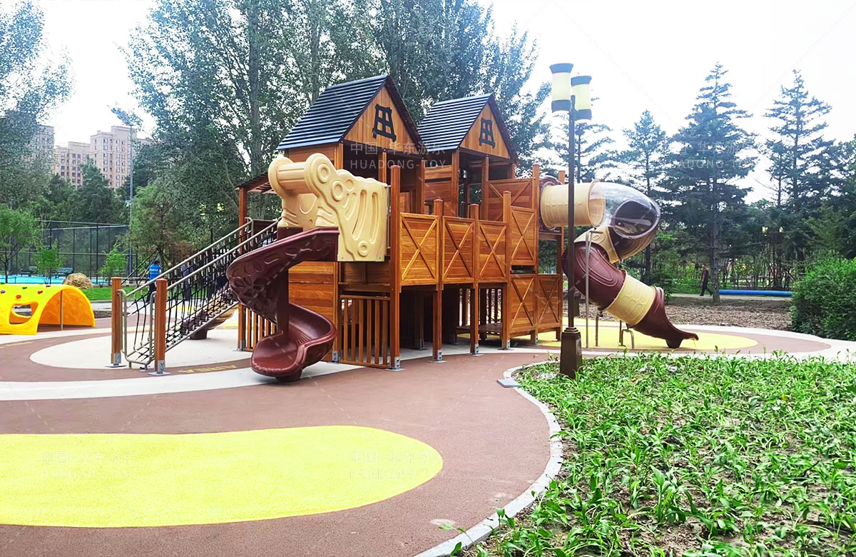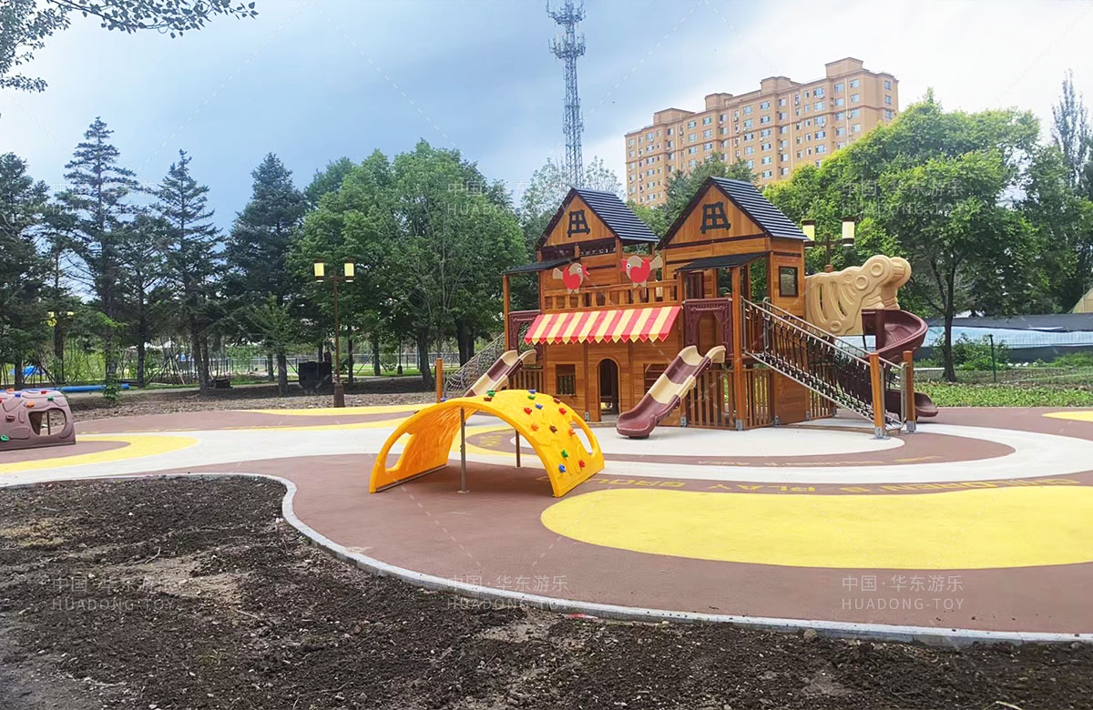 吉林省白城市洮北區(qū)兵器城小區(qū)是一個綜合類型的居民小區(qū),該小區(qū)設置了各種類型的 游樂設施,為了更好的為人民提供一個休閑娛樂的場所,此次選用的是華東游樂自主研發(fā)和設計的木質小屋系列的組合滑梯,除此之外還設置了孩子們喜歡的各種攀爬游樂設備。