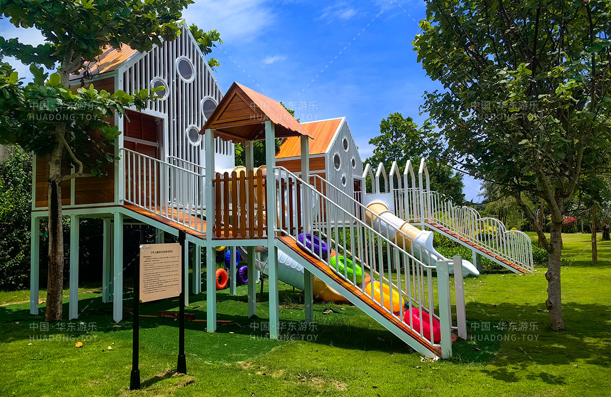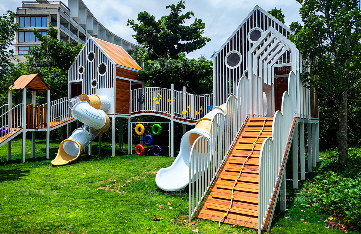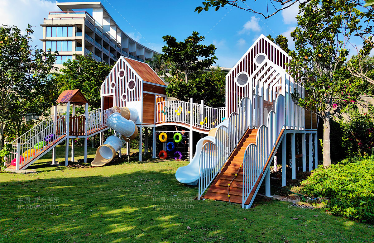 三亞天涯藍海度假酒店是一個高端的休閑、旅游度假酒店,為了更好的為各位客戶提供更加高端和更加完美的旅行服務(wù),該酒店選用了華東游樂自主研發(fā)和設(shè)計的非標(biāo)定制的多功能組合游樂設(shè)備,該設(shè)備具備了攀爬繩、攀爬網(wǎng)、旋轉(zhuǎn)滑梯、游戲小屋等系列功能。